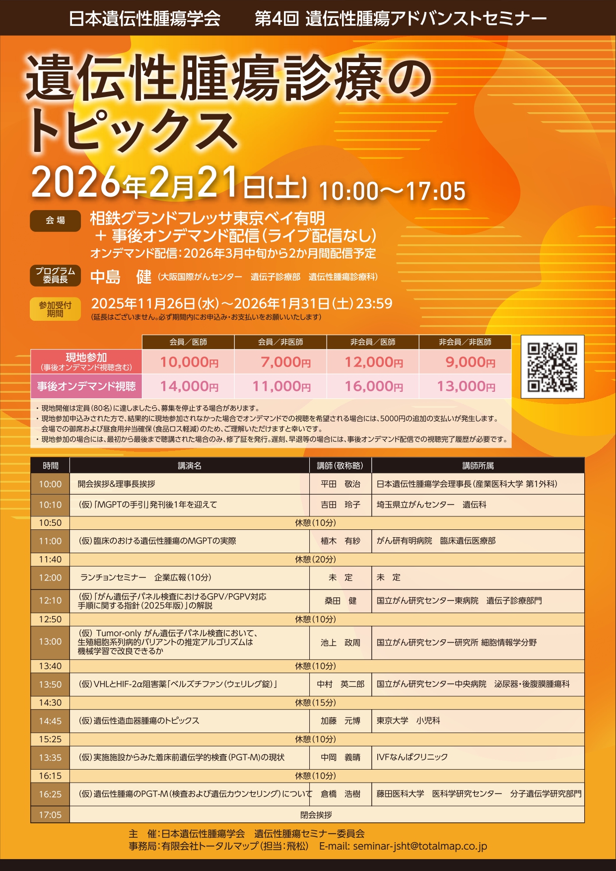 遺伝性腫瘍セミナー運営事務局から、第4回遺伝性腫瘍アドバンストセミナーのお知らせをいただきました。