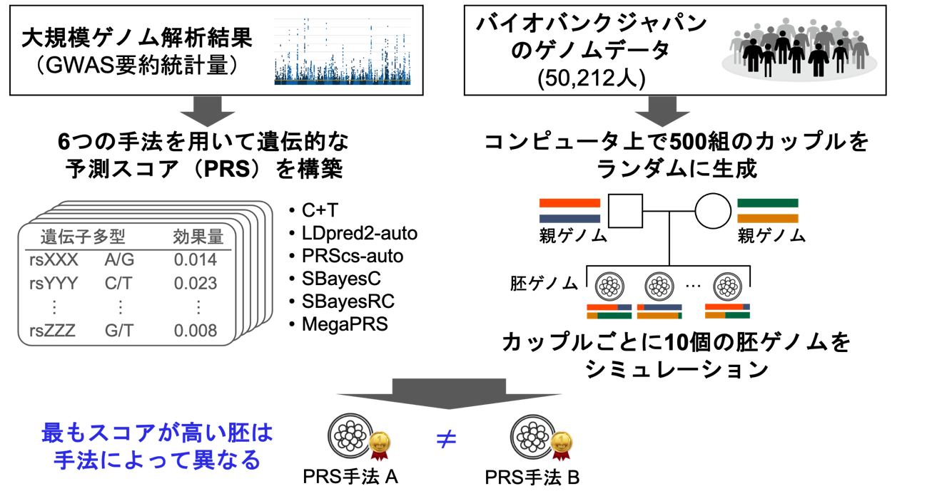 PRSの予測性能を高めるためにベイズ統計や機械学習等の様々な手法が提案されているものの、際立って優れた計算手法は存在せず、研究者によって異なる計算手法が使われている。本研究では6種類の主要なPRS計算手法を用いて、配偶者選択の対象として知られる成人の身長を対象としたPRSを構築した。また、バイオバンクジャパンの公開ゲノムデータを利用して仮想的に500組のカップルを生成し、遺伝子組み換え過程を再現したシミュレーションにより、各カップルに10個の胚ゲノムを生成した。これらの胚ゲノムに対して6種類のPRSを適用し、胚の順位のPRS手法間での一貫性を検証した。