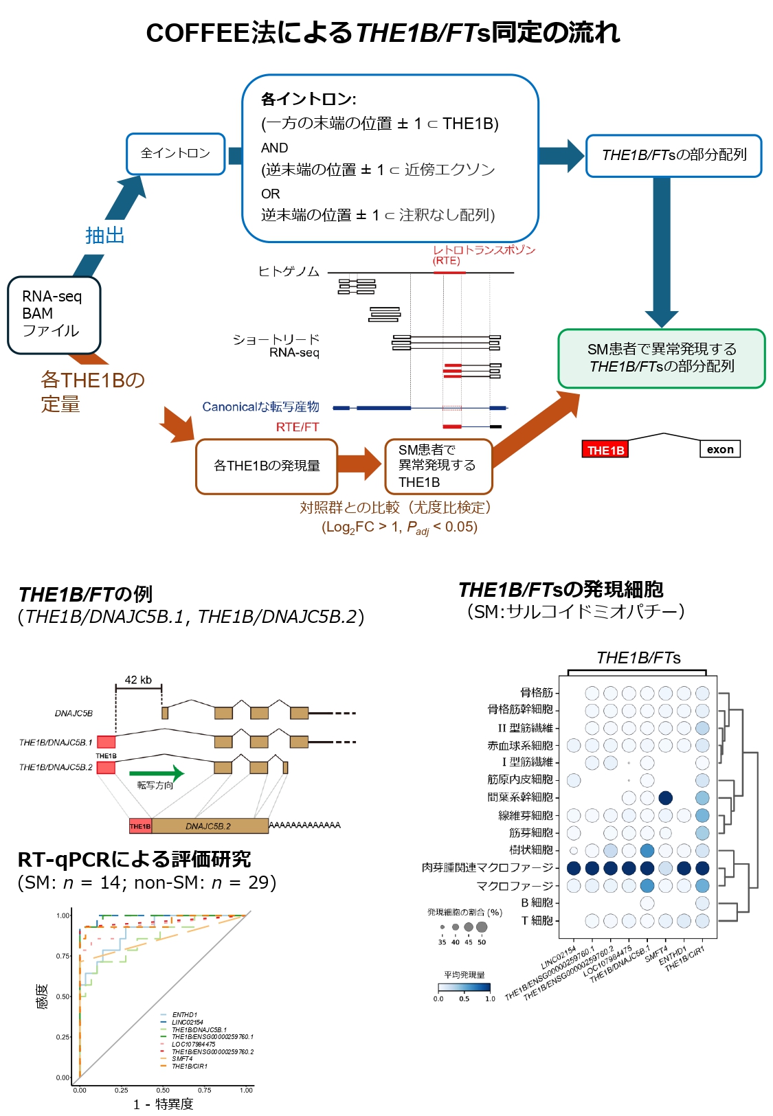 本論文では独自に開発したRTE解析用コンピュータ解析プログラム(COFFEE;以下COFFEE法)を用いて、サ症において19種類のTHE1B融合転写産物(THE1B fusion transcripts: THE1B/FTs)が異常発現していることを世界で初めて報告した。さらに、シングル核/シングルセルRNA-seqにより、THE1B/FTsがサ症の肉芽腫関連マクロファージで発現していることを見出した。